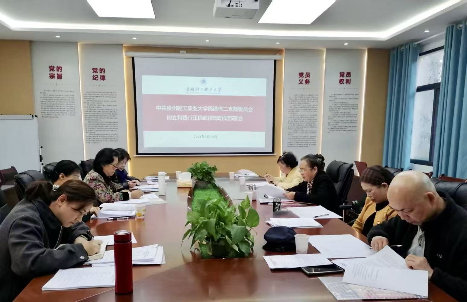3月13日上午,离退休二支部在贵州老年大学“乐学家园·黔老先锋”会议室召开树立和践行正确政绩观学习教育动员部署会。会议由党支部书记陈爱萍主持,学校党委组织部离退休科科长杜纪红列席,离退休二支部全体党员参加。