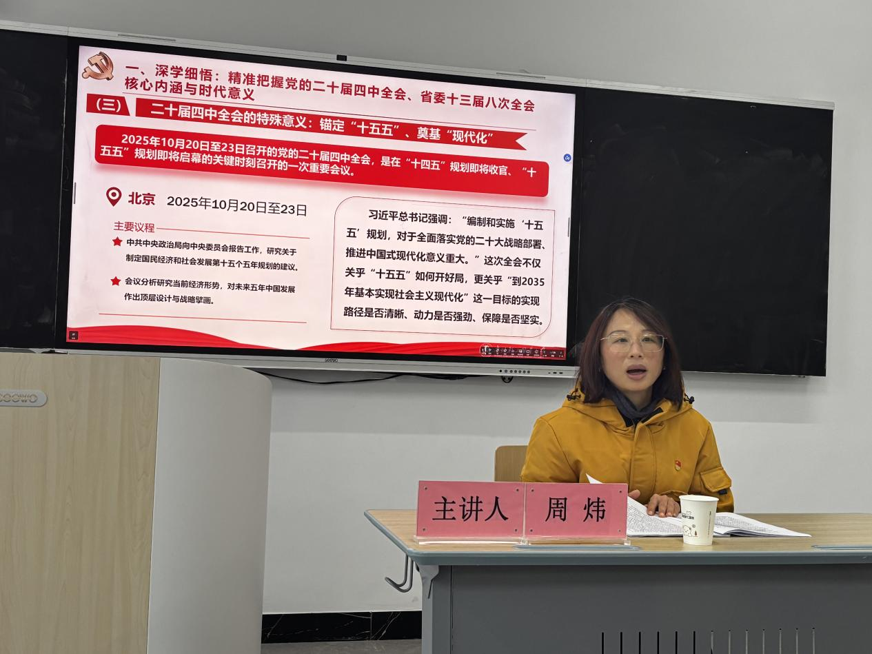 本次党课紧扣党的二十届四中全会核心要义,周炜书记立足“十五五” 时期承前启后的关键定位,结合学校党建与教育事业发展实际,进行了系统阐释和深入解读。她以全会召开的时代背景为切入点,向大家深刻阐明了四中全会在基本实现社会主义现代化进程中的重大历史意义,详细解读了 “六个坚持” 的重要原则与高质量发展的核心要求。针对两个支部的特点,周书记围绕“深学细悟全会核心内涵”“领会‘十四五’成就与‘十五五’要求”“把握教育事业新方位”“践行全会精神实践路径”四个维度逐一展开,既有理论要义的深刻阐释,又有现实实践的具体指导,为党员同志们明晰了工作方向、提供了行动遵循。