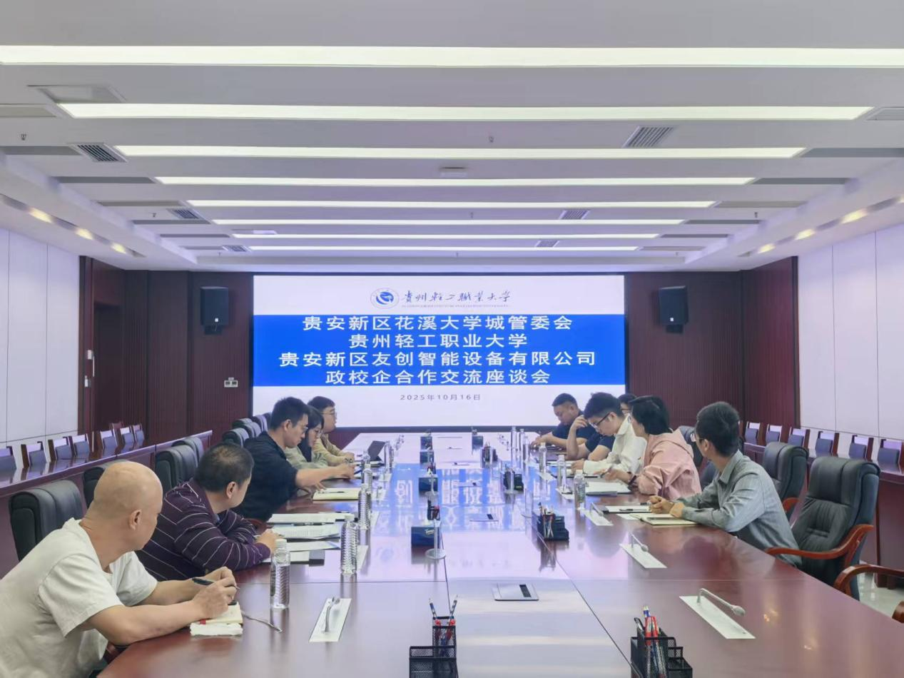 10月16日,贵安新区大学城党工委委员、管委会副主任王达娟同志、贵安新区友创智能设备有限公司副总经理吴迪一行,到我校参观考察并举行政校企合作交流座谈会。党委委员、副院长王珂佳出席会议,校企合作处、信息工程系、机电工程系负责人参会。会议由校企合作处处长吴玫主持。