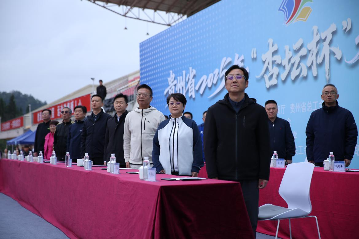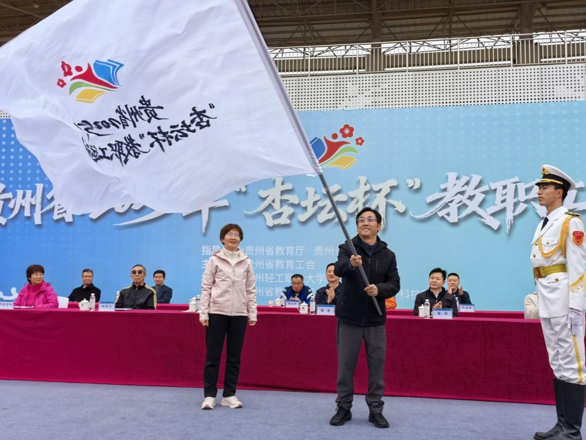 贵州省总工会党组书记、副主席彭旻在讲话中指出,举办“杏坛杯”是工会服务职工身心健康、增强团队凝聚力的重要举措,希望全体教职工赛出风格、赛出水平,将赛场激情转化为推动教育强省建设的磅礴动能。随后,江山向贵州轻工职业大学授予“杏坛杯”会旗,贵州轻工职业技术学院院长杨天仪接旗,运动员代表张迅、裁判员代表钱宇轩分别宣誓,承诺恪守体育精神,公正执裁、公平竞赛。