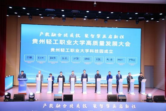11月27日,在贵州轻工职业大学“产教融合提质效,聚智擘画启新程”高质量发展大会期间,贵州轻工职业大学科技园成立仪式作为核心议程隆重举行。贵州省教育厅党组成员、副厅长张命华,贵安新区花溪大学城党工委副书记、管委会主任刘华,贵州轻工职业技术学院党委书记张勇,党委副书记、院长杨天仪等领导,与来自政府、行业、企业、科研院所和高校的百余位代表共同见证这一重要时刻。