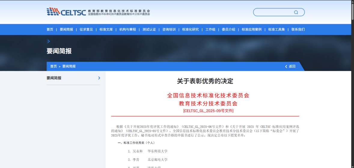 近日,全国信息技术标准化技术委员会(CELTSC)正式公布了“2025年标准应用优秀案例”评选结果。贵州轻工职业大学申报的《数字化赋能职业教育高质量发展——智慧校园建设的创新实践与探索》项目成功入选,成为全国获评的30项优秀案例之一,也是贵州省本次唯一入选的案例。这是学校在职业教育信息化建设领域的一项突破性成果。
