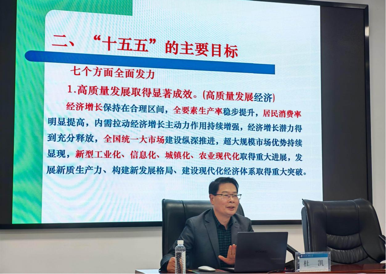 本次党课聚焦全会部署的“十五五”规划相关内容。杜教授围绕“十五五”的历史方位、主要目标、首要任务、关键抓手和教育篇章五部分内容对党的二十届四中全会精神、“十五五”时期发展相关部署进行全面宣讲和深入阐释。最后,从科技、人才、教育等重点领域解读了“十五五”规划对职业教育工作的指引,解读了新兴产业、未来产业发展趋势与职业教育的契合点,让师生对“十五五”规划的战略意义有了深刻理解。
