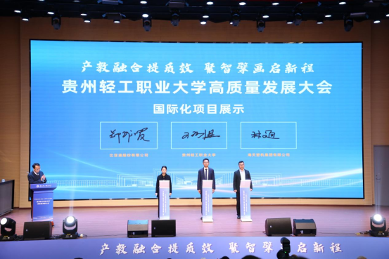 在大会的国际化项目展示环节,海天塑机集团为机电工程系学子捐赠5万元专项奖学金,助力本土技能人才成长,并向泰国新能源汽车技术班学生及东盟、中亚等地区的留学生颁发定制海天大学徽章,彰显了企业对系部国际化人才培养的认可与支持。同时,学院党委委员、副院长王珂佳代表学校,与海天集团、比亚迪股份有限公司分别签署协议,共建“贵匠工坊”。这一合作将聚焦新能源汽车、智能制造等机电工程系核心优势领域,深化“中文+技能+文化”培养模式,既为本土学子搭建对接国际标准的实训舞台,也为海外学子提供掌握前沿技能的成长路径,推动贵州职业教育优质资源“走出去”,同时满足中资企业海外发展的人才需求。