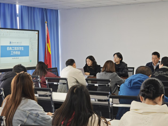 2025年11月12日,机电工程系在精工楼521会议室召开学生工作例会。会议由党总支副书记李静主持,党总支书记韩飞、学生管理科科长董慧娟及全体辅导员、班主任参