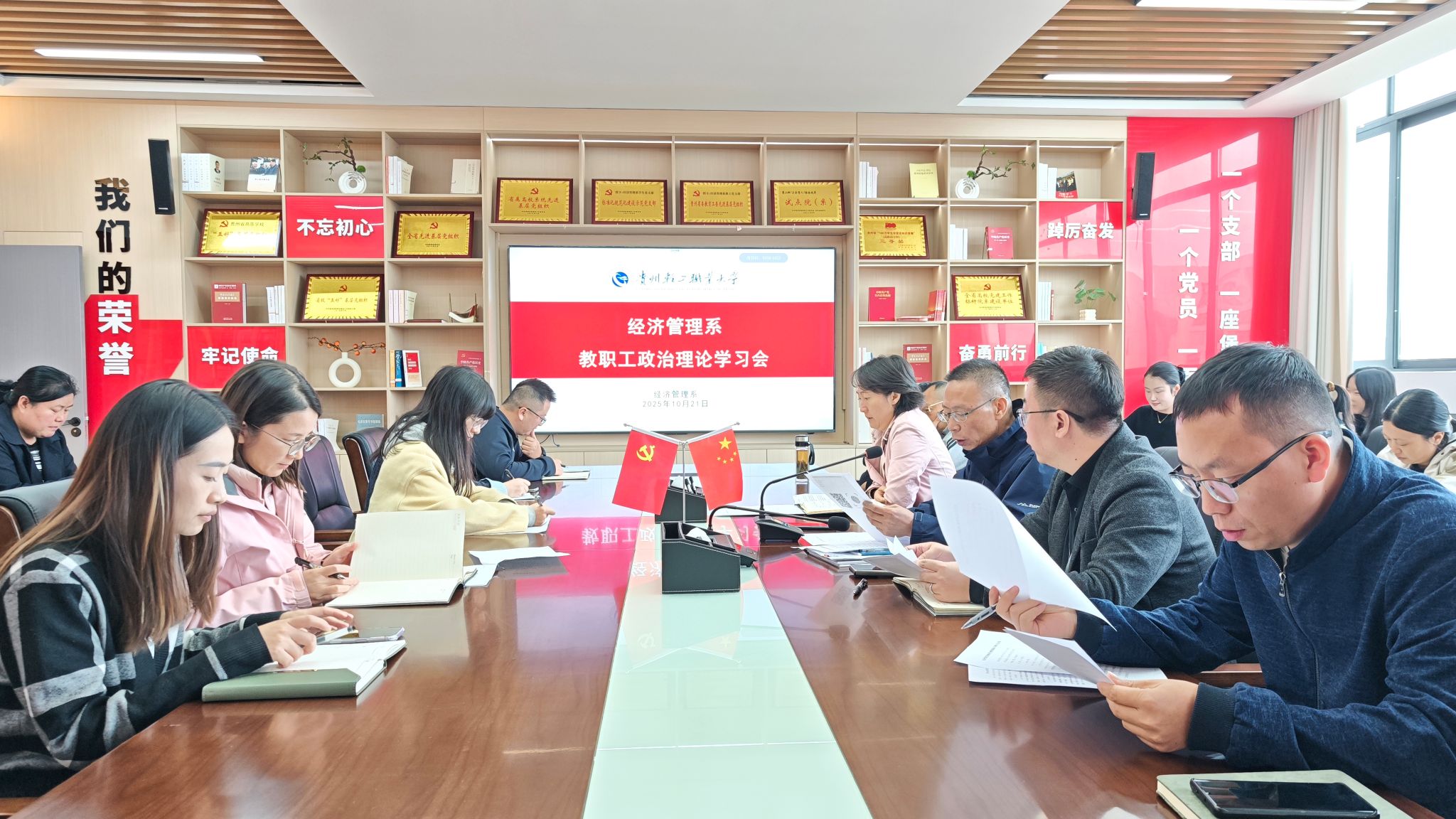 10月21日,经济管理系组织召开集中政治理论学习会,系党总支书记李五祥主持会议,系党总支副书记、主任梁鹏飞,系党总支副书记孙泽富,副主任滕丽娜出席会议,全体专兼职教师参加学习。