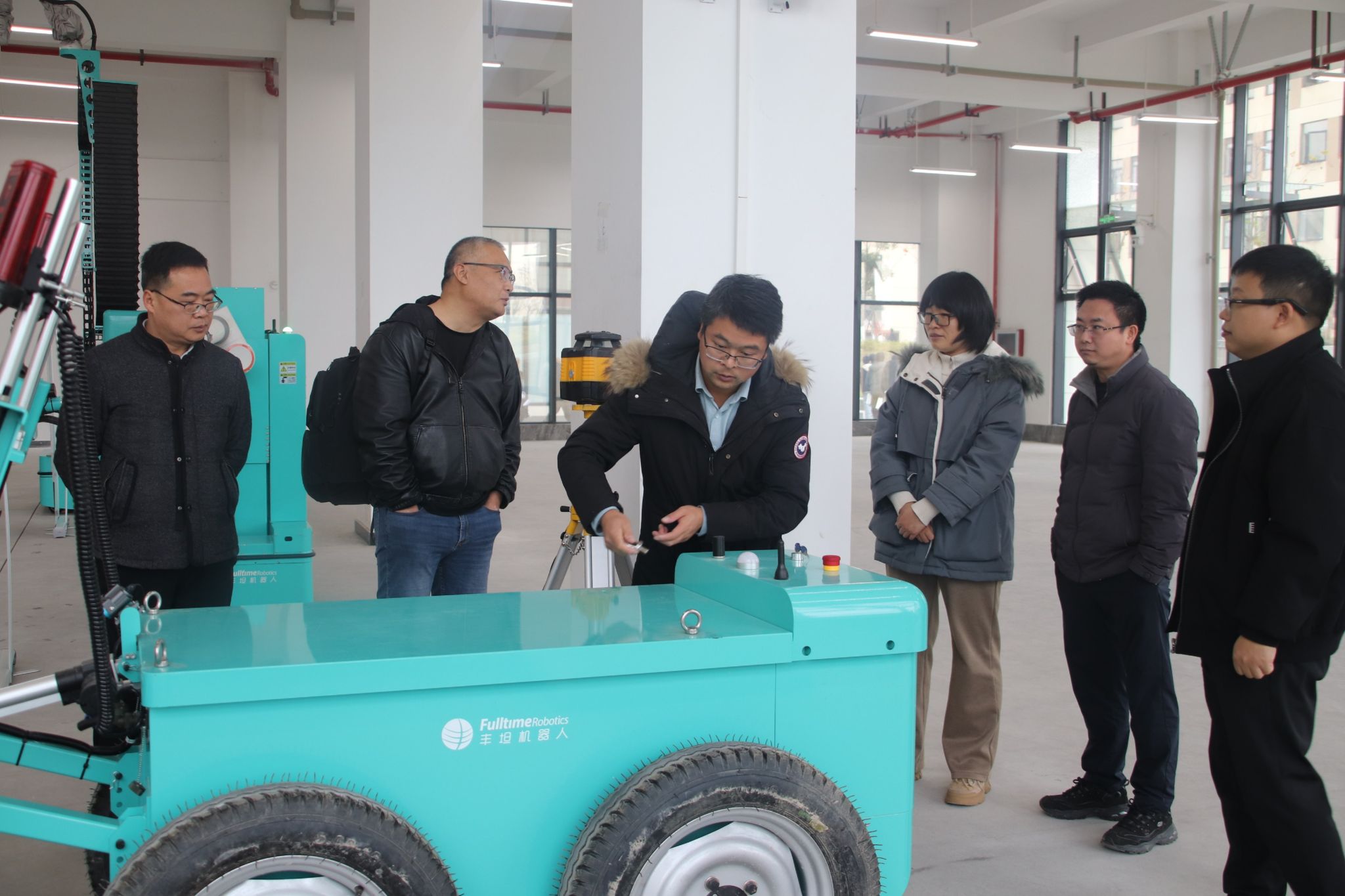 报告结束,参会人员赴营造楼113实训室,参观了由杭州丰坦机器人有限公司的技术团队带来的混凝土整平机器人、喷涂机器人、安全巡检机器人等建筑机器人操作及作业演示,并进行了技术探讨。