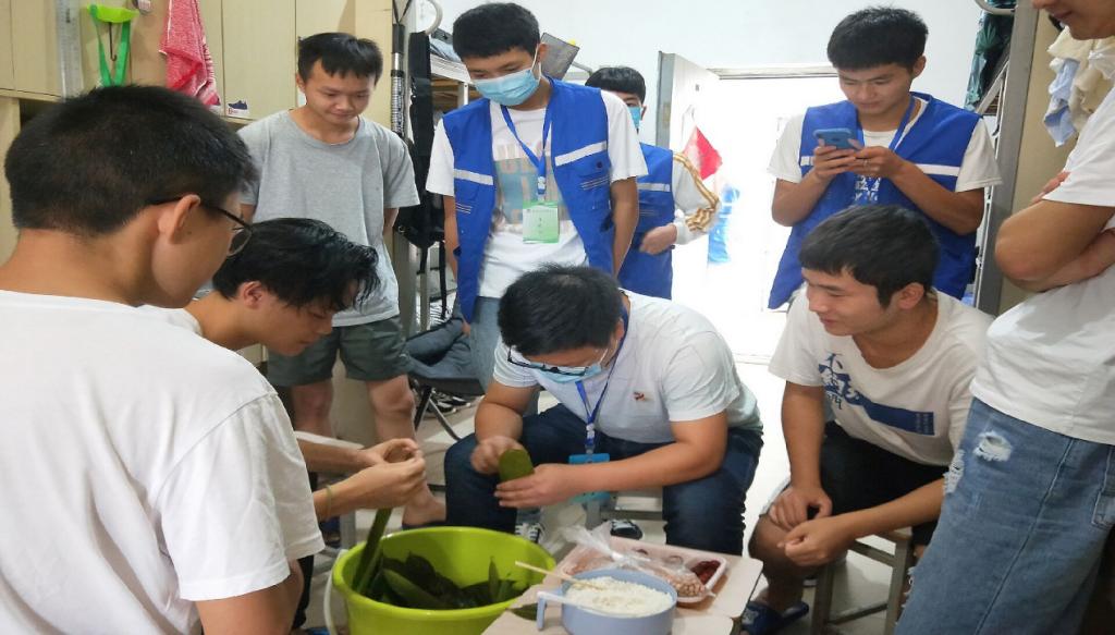 与此同时,周前兵老师带领学生干部深入学生宿舍,与同学们一起包粽子,以如此特殊的方式欢度传统佳节,同学们纷纷表示:虽然因为疫情影响而不能回家,但是老师和同学一起过节,切身感受到了学校的关怀,这个端午节很开心,很值得纪念。大家纷纷表示:只要我们全体中国人民团结在一起,相信我们一定能完全战胜疫情,希望国家越来越好,生活越来越美。