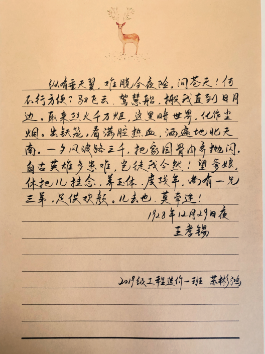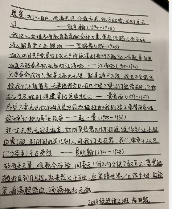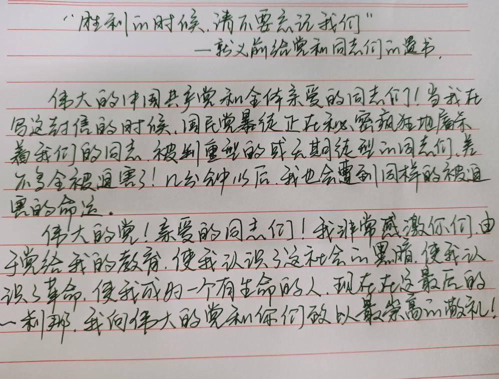 “红色家书”表现出革命者真实的党性。在“红色家书”书法比赛中,同学们通过抄写革命先烈的一封封感人至深的家书,深深地感受到了革命先烈们的崇高革命情怀和英勇无畏的精神;看到了革命先烈对理想信念的坚守和对党的忠诚本色;在思想上受到了洗礼、精神得到了升华、灵魂得到了触动。