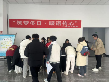 寒冬已至,为营造温馨和谐的校园氛围,增进师生之间的情感交流,让同学们在凛冽的冬日中感受到来自集体的温暖与关怀。近日,建筑工程系团总支联合学生党支部在营造楼一楼大厅组织开展了“筑梦冬日·暖语传心”主题活动。系学生党支部宣传委员吴凤霞老师到场指导并参与活动。