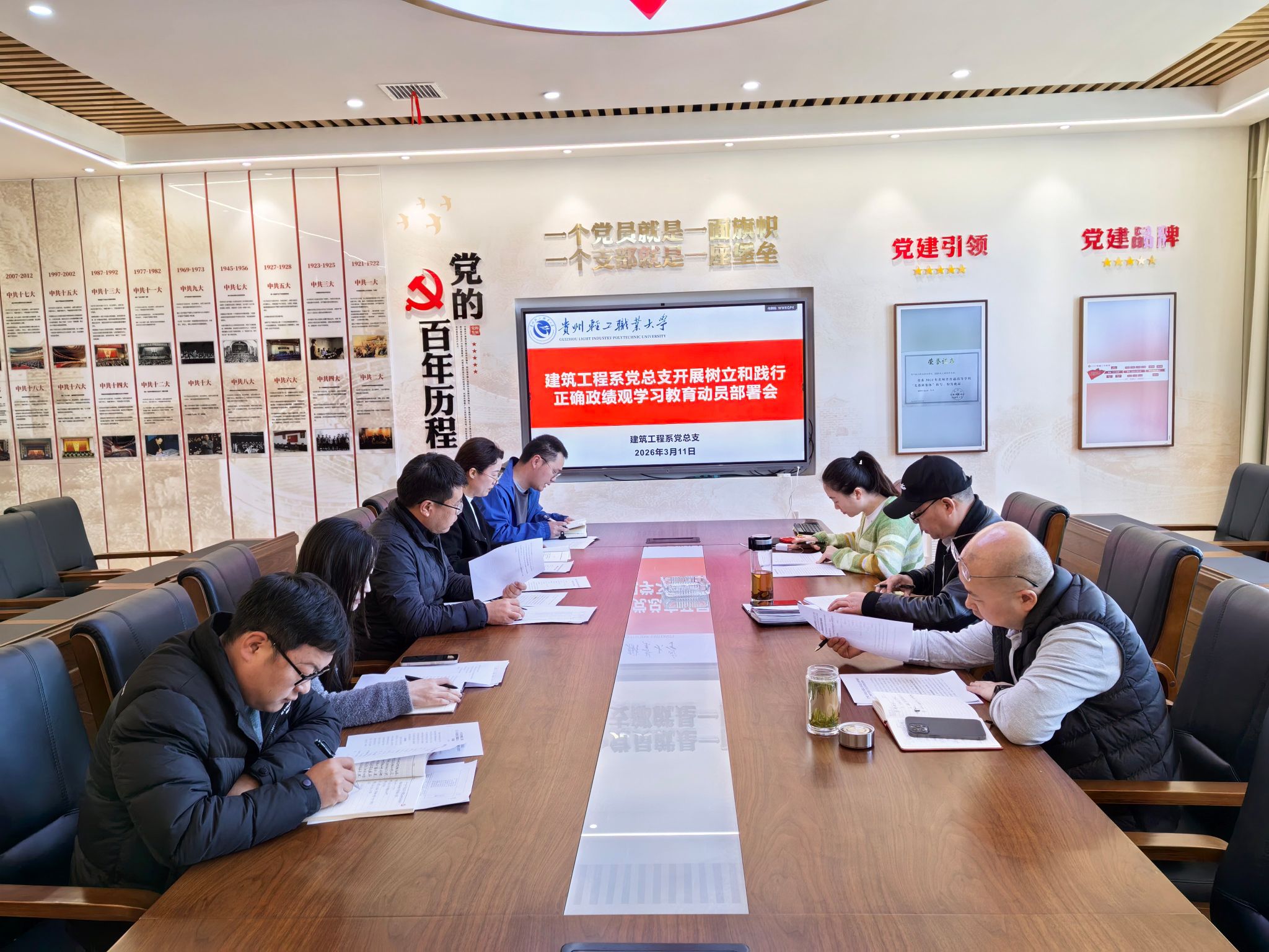 会上集中学习了习近平总书记关于树立和践行正确政绩观的重要论述、中央党的建设工作领导小组会议精神,省委常委会暨省委党的建设工作领导小组会议、省委教育工委召开扩大会议和学校党委关于树立和践行正确政绩观相关会议精神,传达学习了《关于在全党开展树立和践行正确政绩观学习教育的通知》《中共贵州轻工职业大学委员会关于开展树立和践行正确政绩观学习教育实施方案》相关文件精神,研究部署建筑工程系学习教育工作。