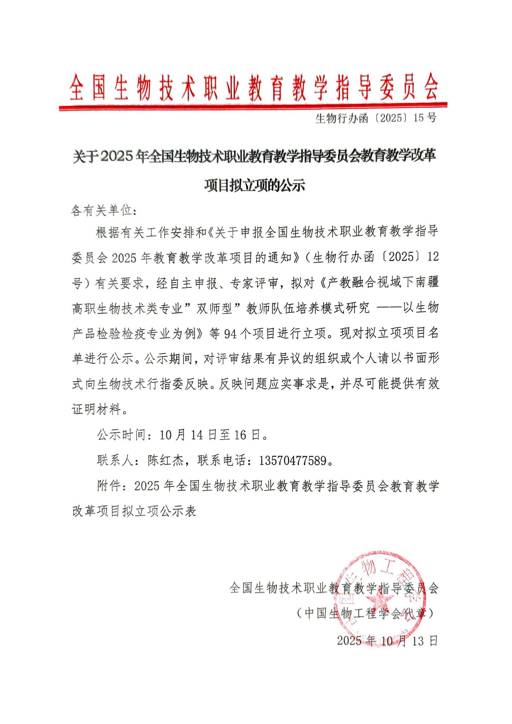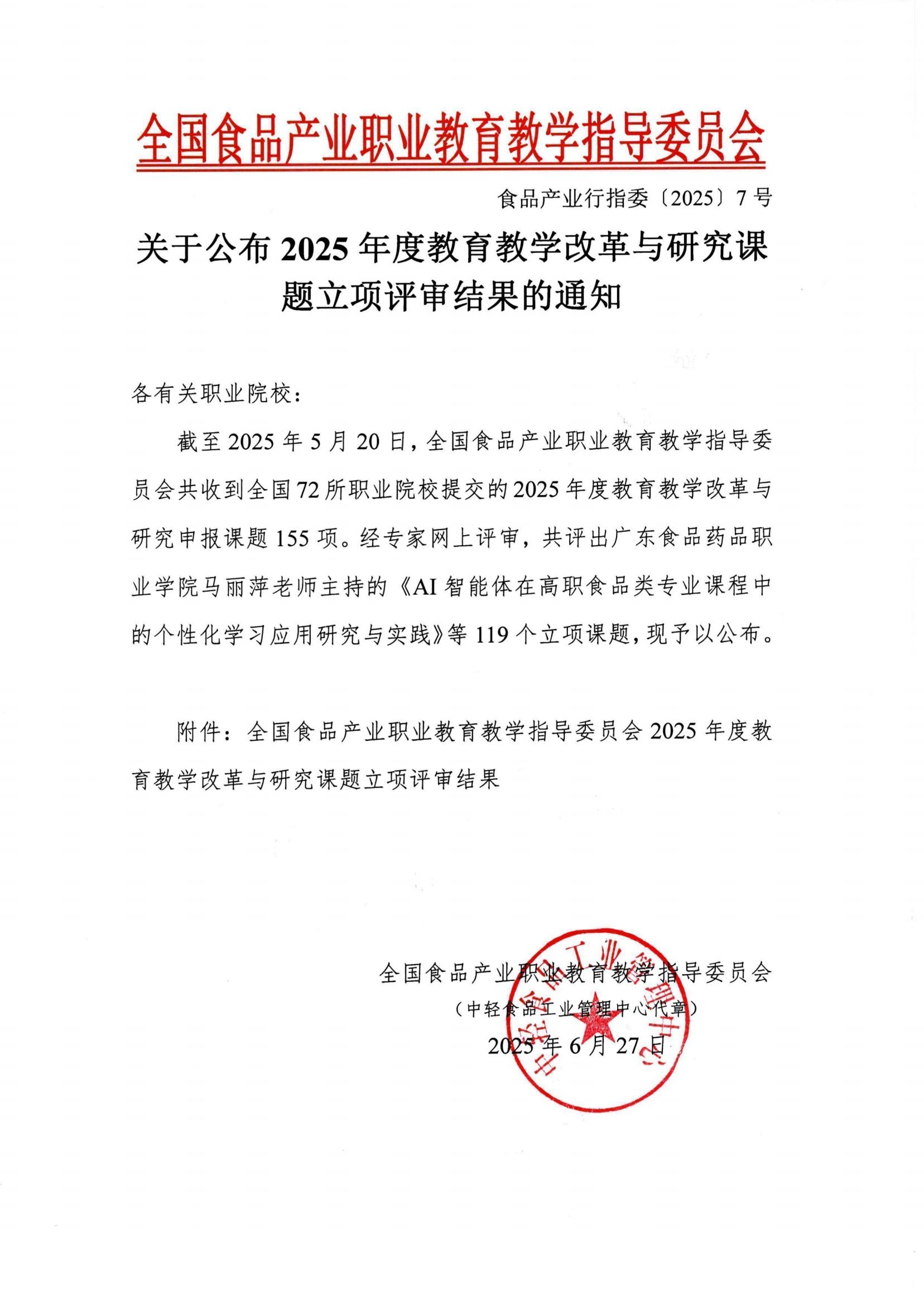 2025年全国食品产业职业教育教学改革与研究课题以及全国生物技术职业教育指导委员会教育教学改革项目立项评审结果揭晓,轻工化工系成绩斐然,共有3个项目成功获批立项。