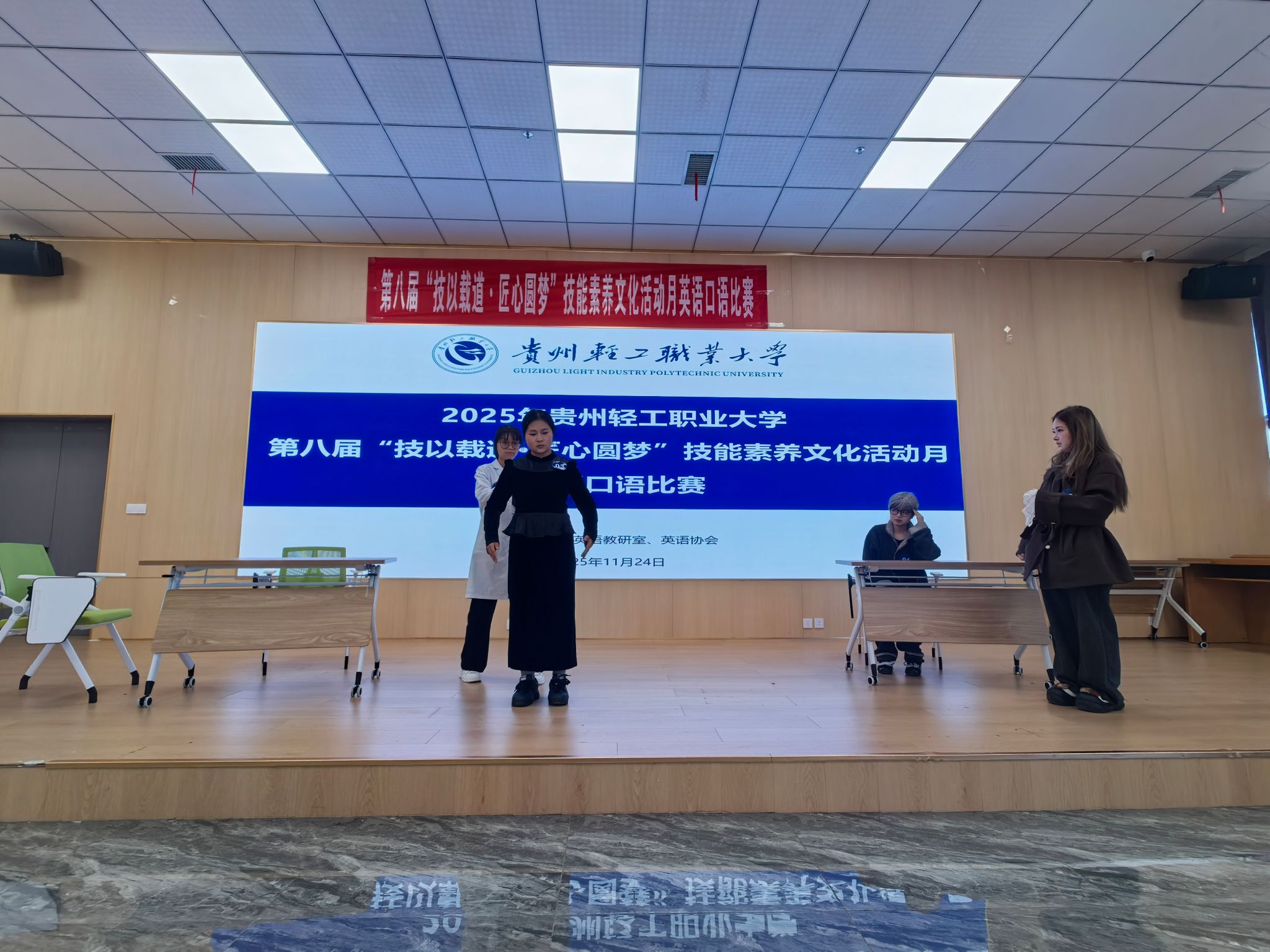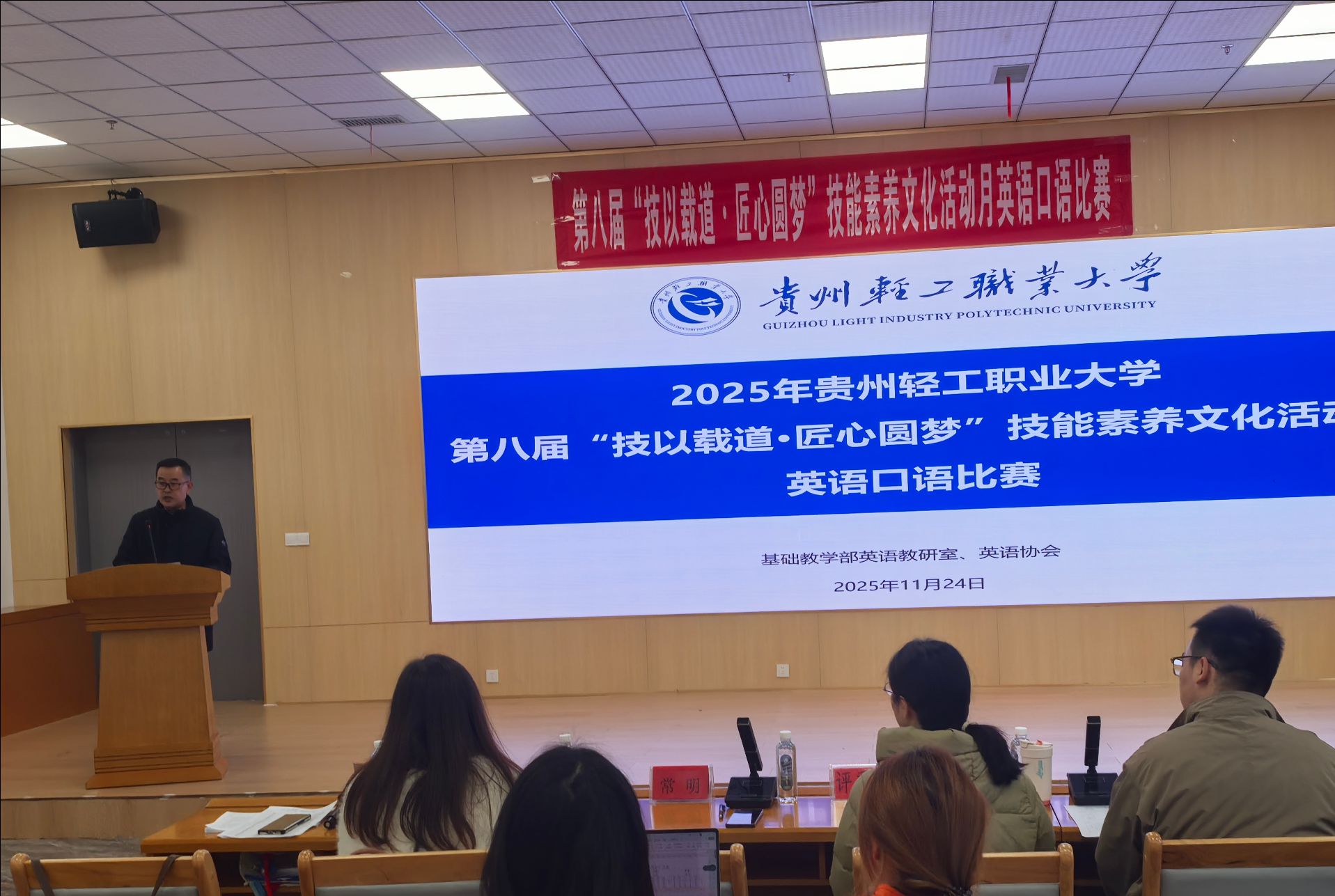2025年11月24日上午9点,第八届“技以载道·匠心圆梦”技能素养文化活动月英语口语比赛在学生事务服务中心匠心书院精彩开幕。本次比赛旨在考察学生在真实工作场景下的英语应用能力与团队协作精神,全校共18支团队、58名选手参赛,盛况空前。