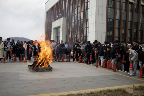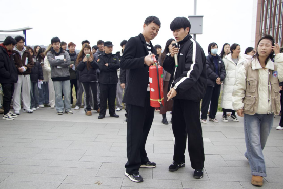 在随后的灭火器实操训练中,聂文涛科长携带干粉、二氧化碳两类灭火器,现场示范“提、拔、握、压”四步标准操作。教师及学生代表依次实操,通过“理论讲解+实操演示+亲自体验”模式,全体师生切实掌握灭火器使用方法,应急处置能力显著提升。
