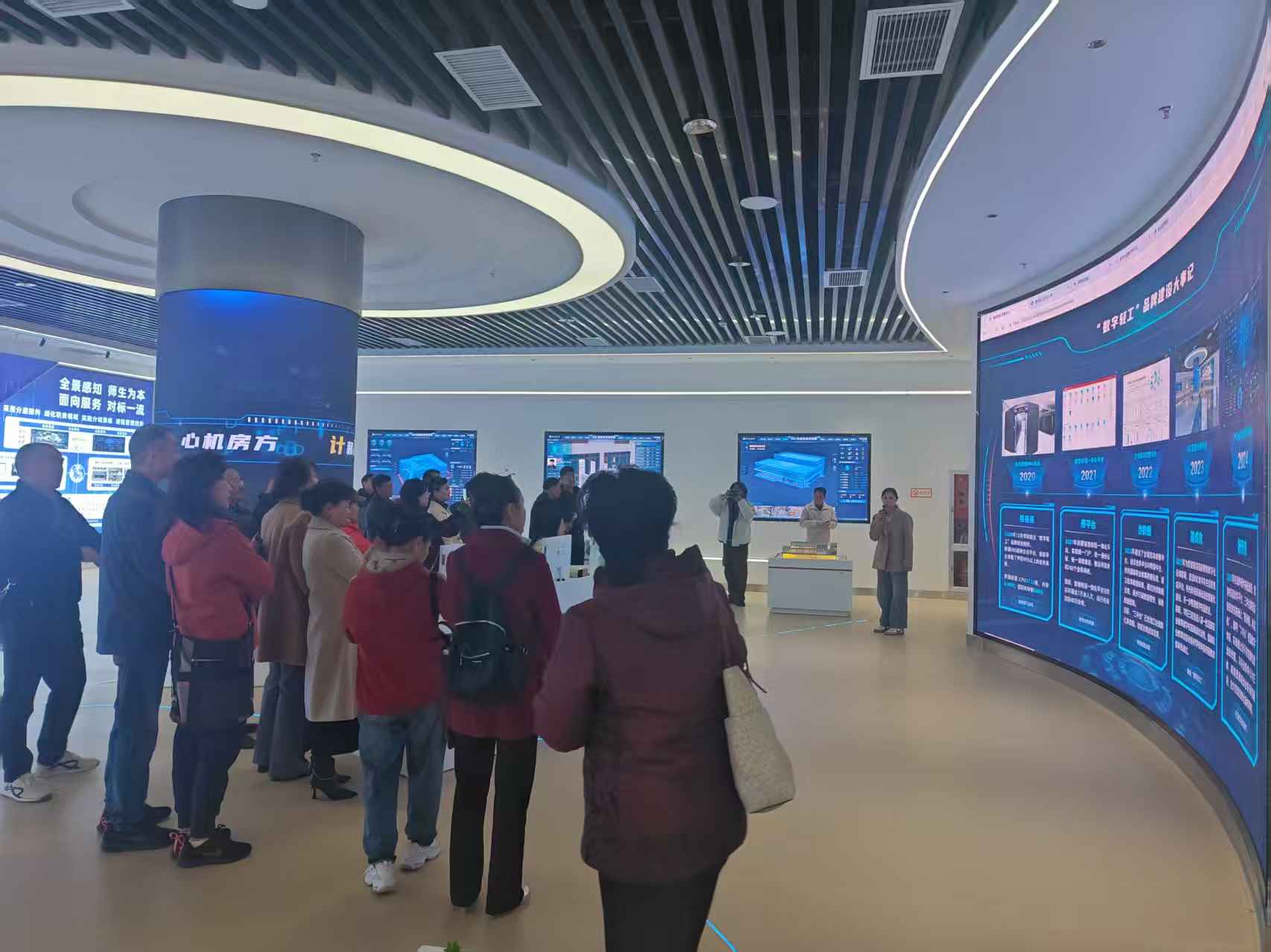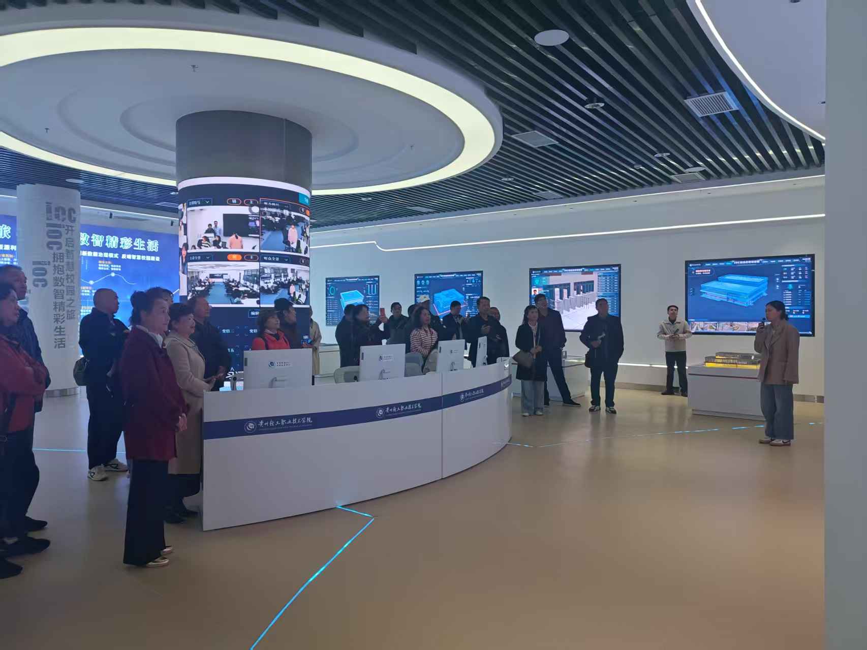 校友们一行实地参观了学院信息中心的智慧校园IOC智能运营中心、数字孪生信息集成平台。