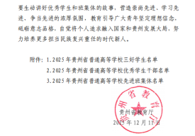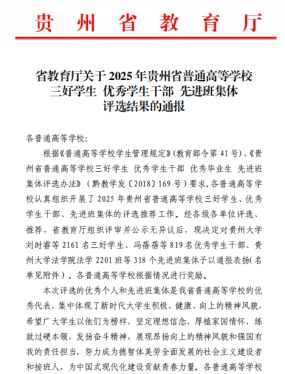 近日,贵州省教育厅公布《2025年贵州普通高等学校三好学生、优秀学生干部、先进班集体评选结果公示》,省级荣誉榜单揭晓,我校一批优秀学子与班集体脱颖而出,成功上榜。