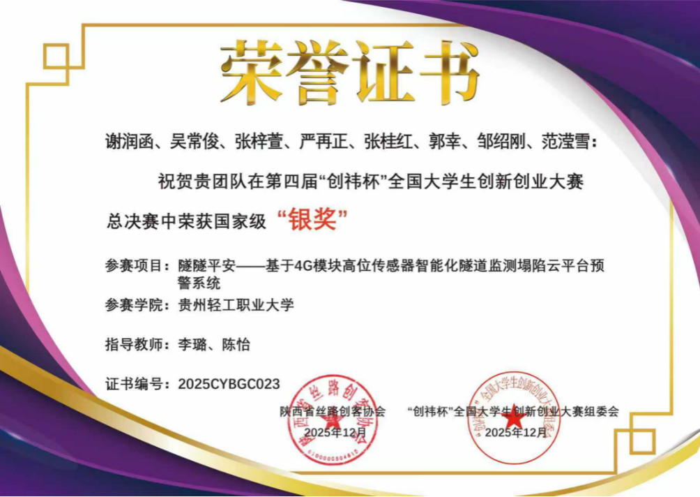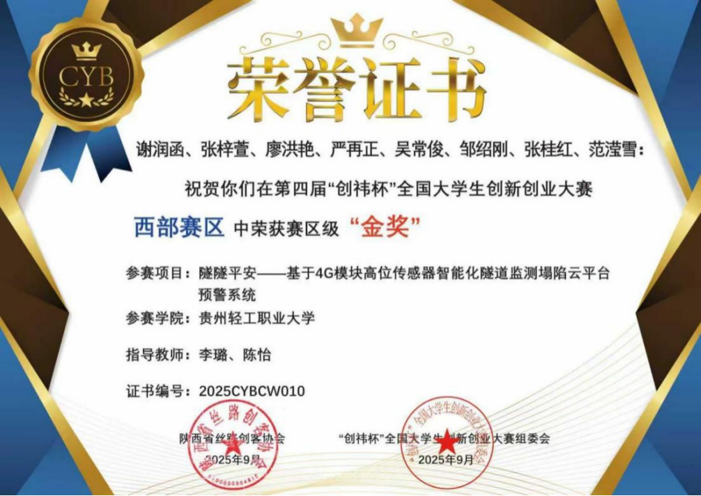 近日,第四届“创祎杯”全国大学生创新创业大赛西部赛区及全国总决赛评选结果相继揭晓,信息工程系大数据众创空间创四方团队凭借《隧隧平安—基于4G模块高位传感器智能化隧道监测塌陷云平台预警系统》斩获西部赛区金奖、全国总决赛银奖,双创之路再添佳绩。本届大赛吸引全国超500所高校优秀团队参赛,通过线上汇报,综合评审项目创新性、商业性及技术方案,选拔技术突破与应用价值兼备的优秀方案。