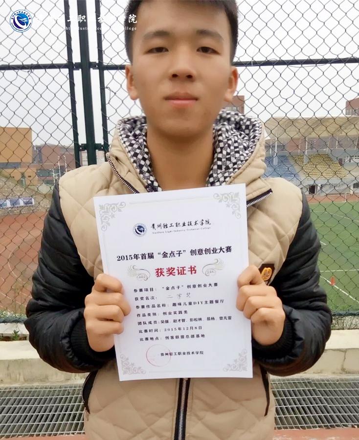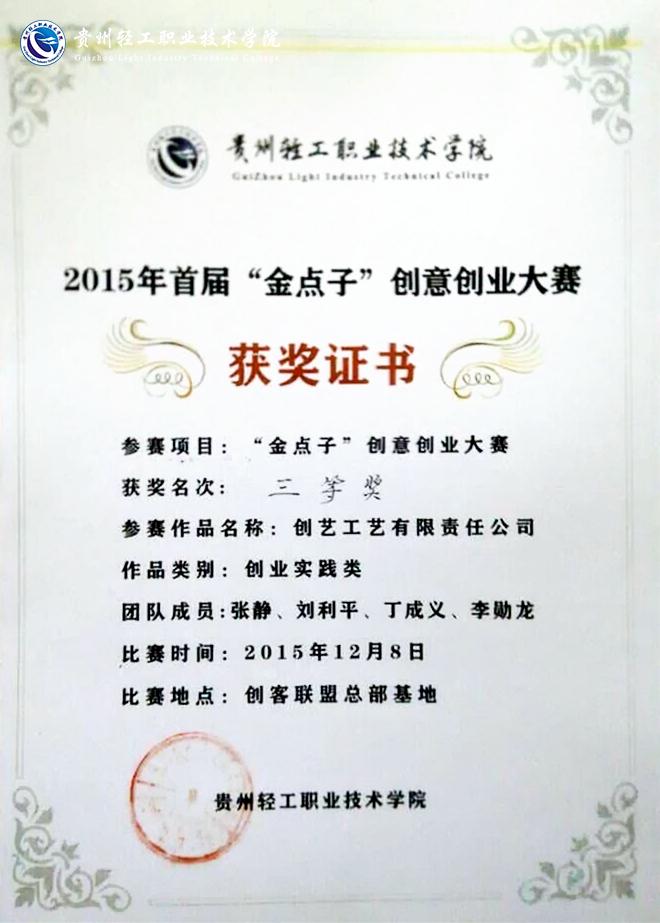 2015年12月8日,艺术设计系15级室内设计技术4班吴强带领的团队及14级装潢艺术设计1班张静带领的团队带着他们的金点子项目参加了贵州轻工职业技术学院首届“金点子”创意创业大赛的决赛,他们的指导老师分别是:杨义、杨佳颖。