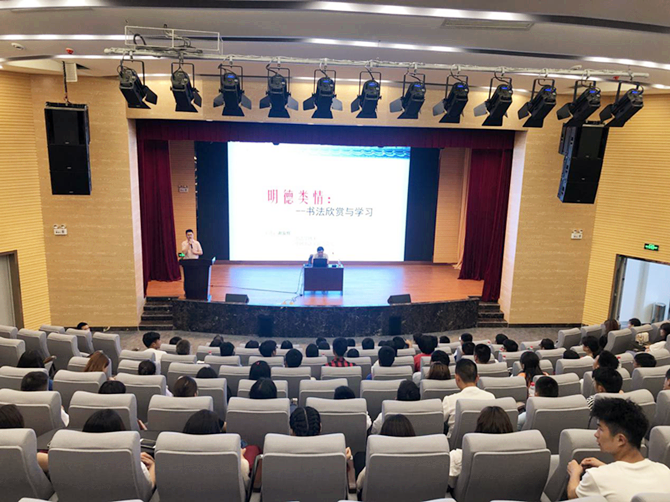 谢安辉老师以“明德类情——书法欣赏与学习”为题,从书法艺术的演变过程,字体、字型结构、书写要素等入手,通过对王羲之、颜真卿等书法大家的作品的详细讲解,为在场的同学们带来了一场书法知识的盛宴,赢得了现场观众的阵阵掌声。