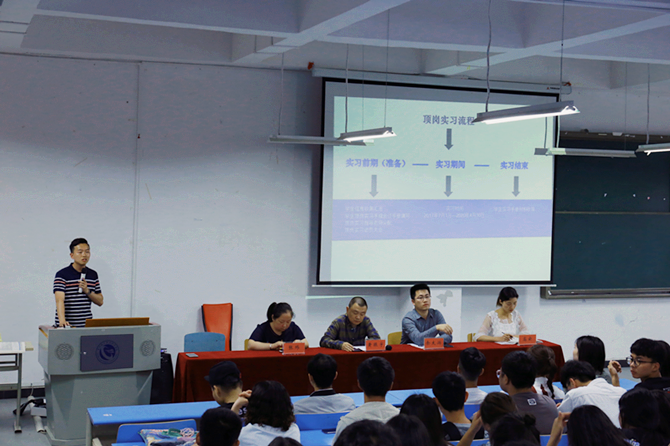 首先由负责本次顶岗实习工作的宋庆胤老师向同学们介绍了顶岗实习的相关流程及注意事项、顶岗实习三个阶段、实习前的各项准备工作,并对学生办理实习手续的流程进行了说明,要根据校内外实习指导老师的要求完成各项任务,按时返校提交相关实习资料。