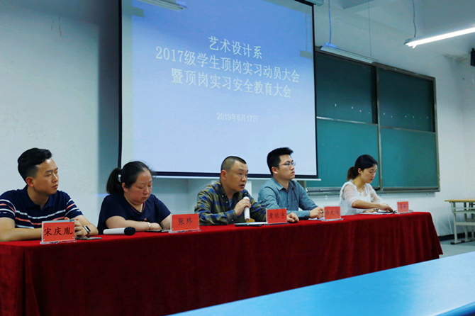 2019年6月17日下午4点10分,艺术设计系组织召开了2017级学生顶岗实习动员大会暨顶岗实习安全教育大会,系主任黄振宇、系党总支副书记余太游、学生管理科科长高云、教学管理科科长张玮以及顶岗实习管理负责人宋庆胤老师出席,会议由张玮老师主持。