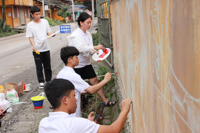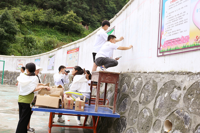雨停后各组志愿者紧急投入到分配的本职任务中。中午天空又下起了雨,直到下午16点,所有志愿者投入到墙绘构图绘制及修复被雨水破坏的墙绘墙壁工作中。