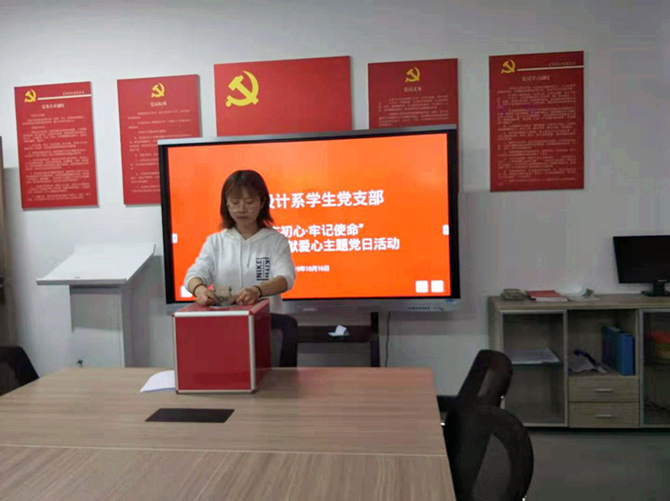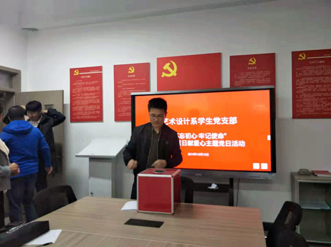 2019年10月16日艺术设计系学生党支部在1312会议室组织“不忘初心、牢记使命”10.17扶贫日献爱心主题党日活动,学生党支部全体教师党员、部分学生党员代表参加本次活动。