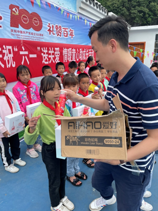 宋庆胤同志代表艺术设计系为德门村的小朋友并带来了儿童节的礼物,包括文具套装、彩铅及绘画本等物品,这些物品不仅能让小朋友们不仅能够感受到节日的祝福,也将在今后起到加强美育教育的作用。