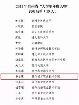 经学校推荐,专家推选,省教育厅网站公示无异议,厅党组会研究同意。我院艺术设计系2019级广告设计与制作1班韦永康同学获评贵州省2021年“大学生年度人物”。