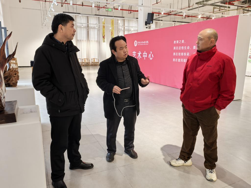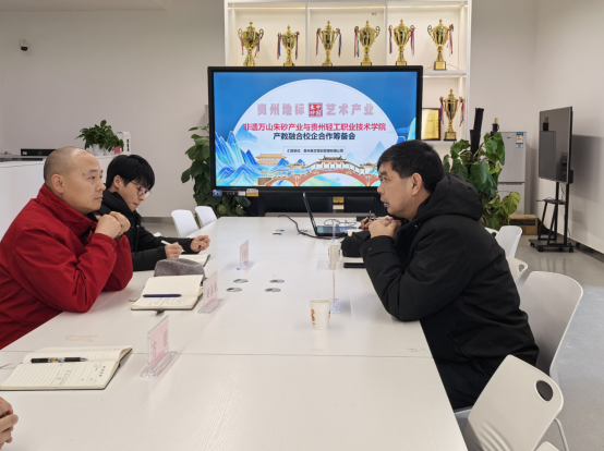 2025年2月24日,铜仁市万山经开区管理委员会投促中心王安民主任,贵州易文策划管理有限公司总经理杨启荣、贵州黔川贵海饮业有限公司总经理甘海莅临我系考察、交流,双方通过参观考察和交流座谈深入交换了合作意见。艺术设计系系主任谢春涛、社会服务与科研科科长李聃铭、教师杨启化、方银陪同参观并出席交流座谈会。