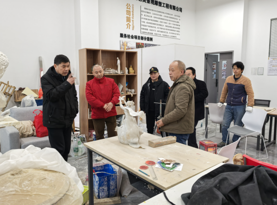 谢春涛主任陪同王安民主任一行人参观我系艺术中心、陶瓷实训室、双创融合实训室、雕塑实训室等教学场所,并向到访嘉宾介绍我系基本情况及我系在艺术设计教育与非遗传承创新中取得的成就。