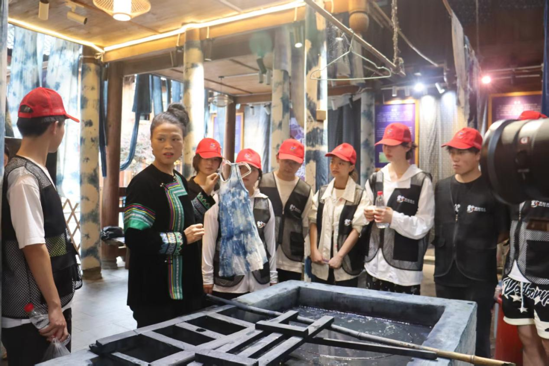 7月1日下午,实践团队首站抵达肇兴侗寨。在当地政府工作人员的引导下,同学们走进侗族博物馆,精美的侗族服饰、璀璨的银饰工艺以及古老的纺织技艺依次展现在眼前,为大家揭开了侗族文化的神秘面纱,搭建起对侗族文化的初步认知框架。随后,大家来到侗品源企业,亲手体验扎染、蜡染、豆染等传统技艺,在染料与布料的交融中感受非遗魅力,同时还深入学习企业的运营模式,探索传统文化与现代产业的融合路径。活动期间,同学们与黎平县融媒体工作人员、当地村民展开热烈交流,从村寨的历史变迁到独特的饮食习惯,每一个话题都让大家对这片土地的人文底蕴有了更深刻的理解。