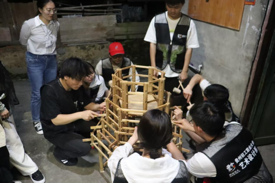 离开肇兴侗寨,团队前往纪堂村。在鼓楼传承人陆德怀老师的悉心指导下,同学们分成三个小组,沉浸式体验鼓楼建造技艺。建造过程中,大家不仅掌握了鼓楼的构造原理和搭建方法,更深刻领悟到其蕴含的文化寓意。看似普通的木材背后,藏着侗族人民对自然与生活的智慧诠释。通过亲手实践,同学们对鼓楼这一侗族传统建筑的内部构造有了全新的认识,也被匠人们精益求精的精神深深打动。