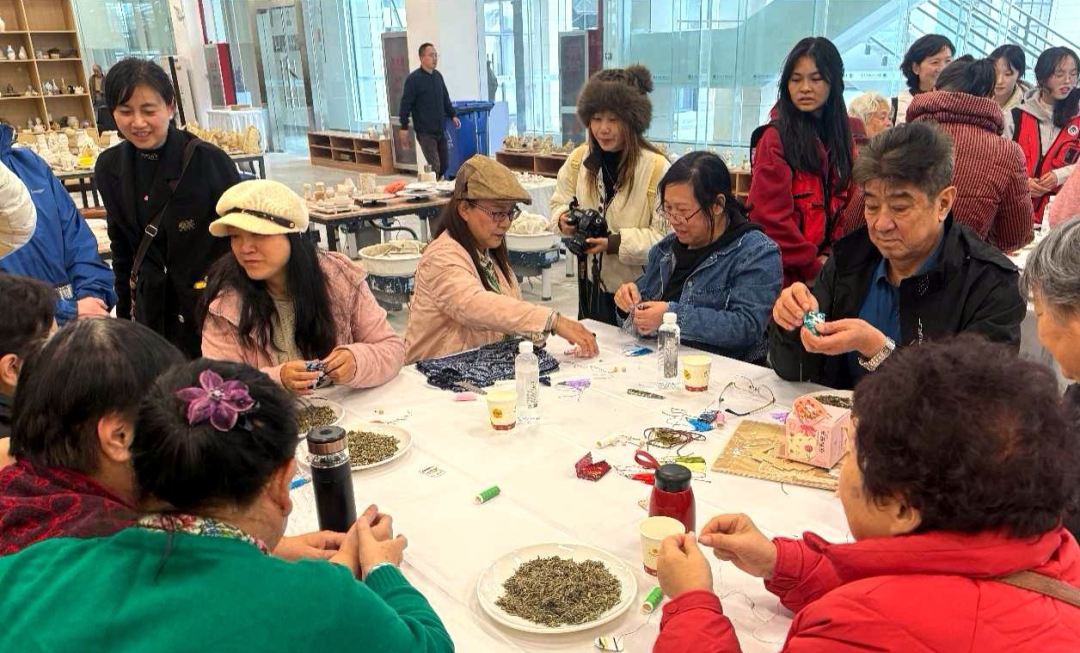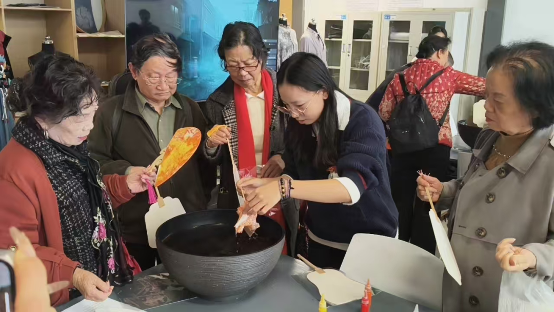 午后阳光和煦,活动现场暖意融融,洋溢着浓郁的艺术气息。离退休教职工们兴致盎然地齐聚一堂,在艺术设计系专业教师和学生志愿者的引导下,开启了一场别开生面的美育实践之旅,沉浸式体验了漆扇、香囊、釉上彩三项蕴含深厚中华美学精神的非遗手工艺。