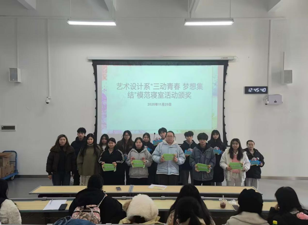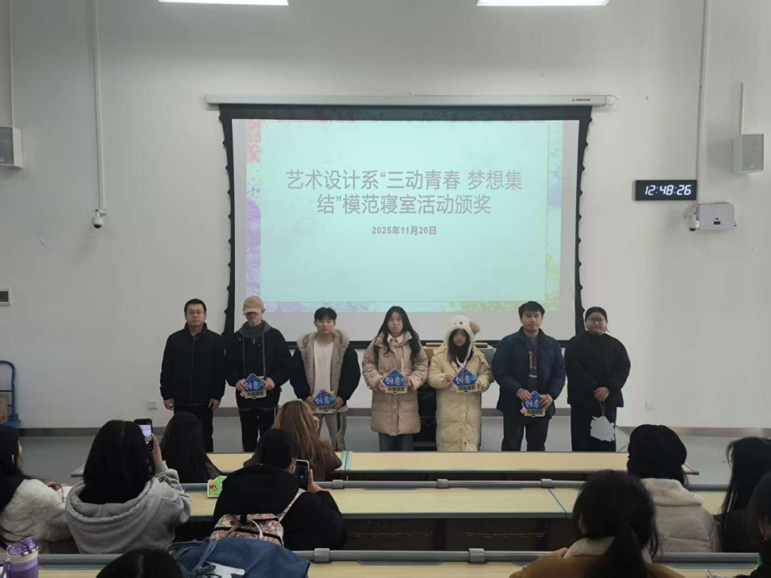 11月20日,艺术设计系举行颁奖仪式。梁欢欢老师和杨佳丽老师为“活力先锋寝室”和“卫生先锋寝室”获奖代表颁奖,并鼓励同学们继续保持良好的精神风貌;杨涵老师为“学习先锋寝室”和“文艺先锋寝室”获奖代表颁奖,勉励大家在专业学习和艺术修养上不断进步;艺术设计系党总支副书记孙鑫岩为“创意先锋寝室”获奖代表颁奖,并在总结发言中充分肯定了本次活动取得的成效。他希望获奖寝室能够发挥模范带头作用,同时鼓励全体同学将专业学习与日常生活更紧密地结合,让艺术设计真正融入宿舍生活。