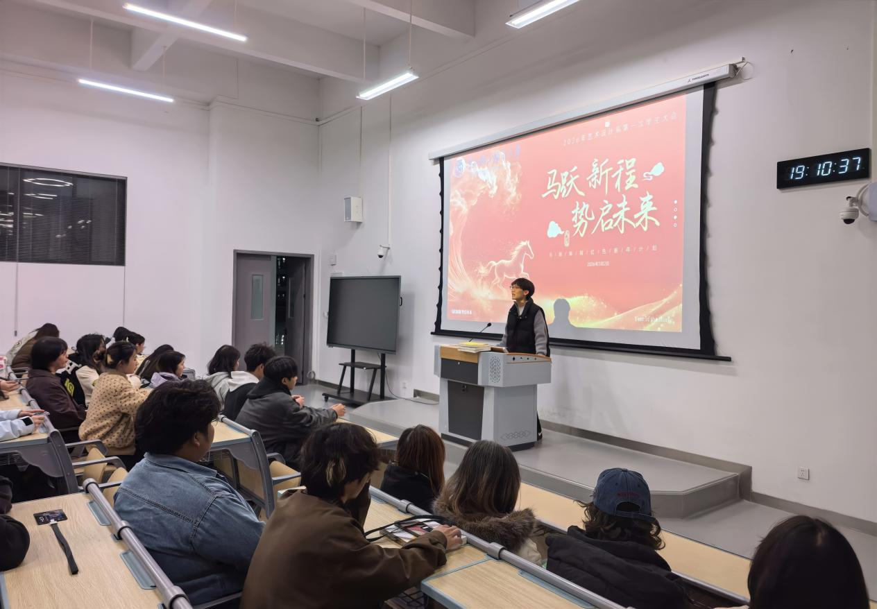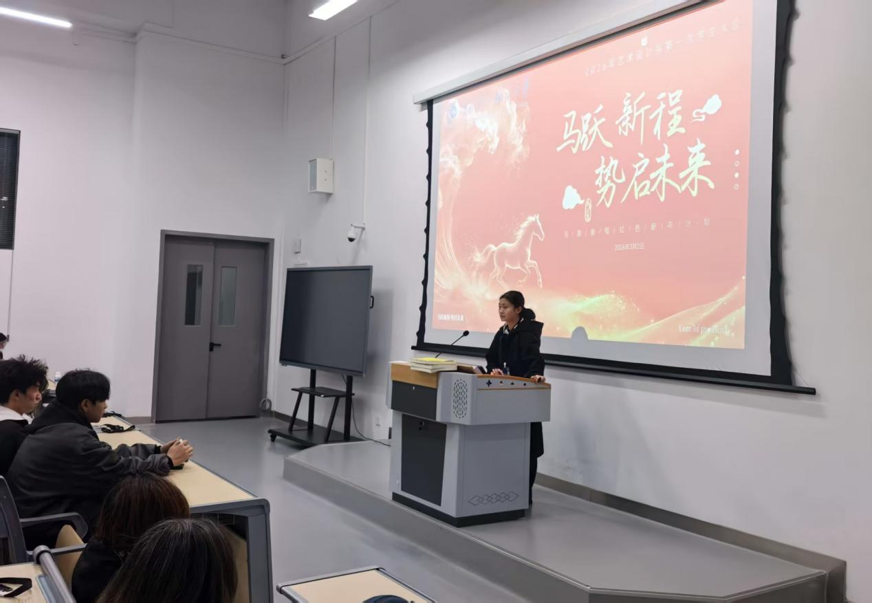 2026年3月2日(星期一),艺术设计系2026年第一次学生会在踵美楼107阶梯教室隆重举行。本次会议以“马跃新程,势启未来” 为主题,寓意在新的一年里,全体学生干部如骏马奔腾,以昂扬之姿开启红色新程,汇聚奋进之力,书写青春华章。