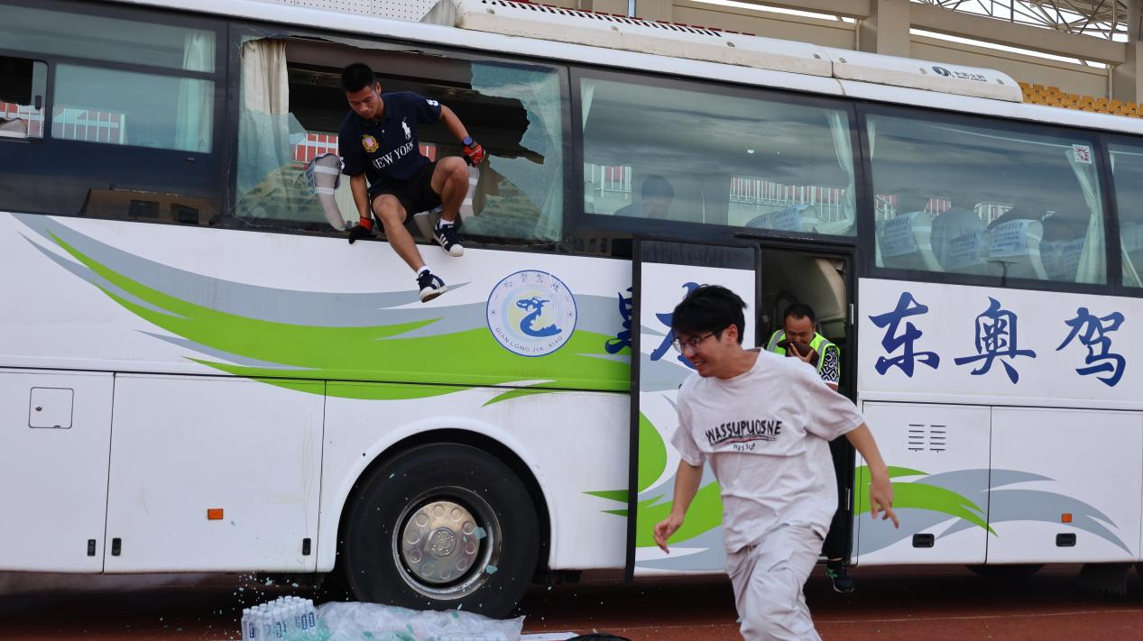 在应急逃生演练中,消防救援站官兵模拟了公交车火灾场景,指导新生如何正确使用破窗器逃生,并现场演示了低姿前行、湿毛巾捂口鼻等关键逃生技巧。随后,新生们分组进行了实战化疏散演练,在规定时间内迅速、有序地完成撤离,应急反应与自救互救能力得到显著提升。