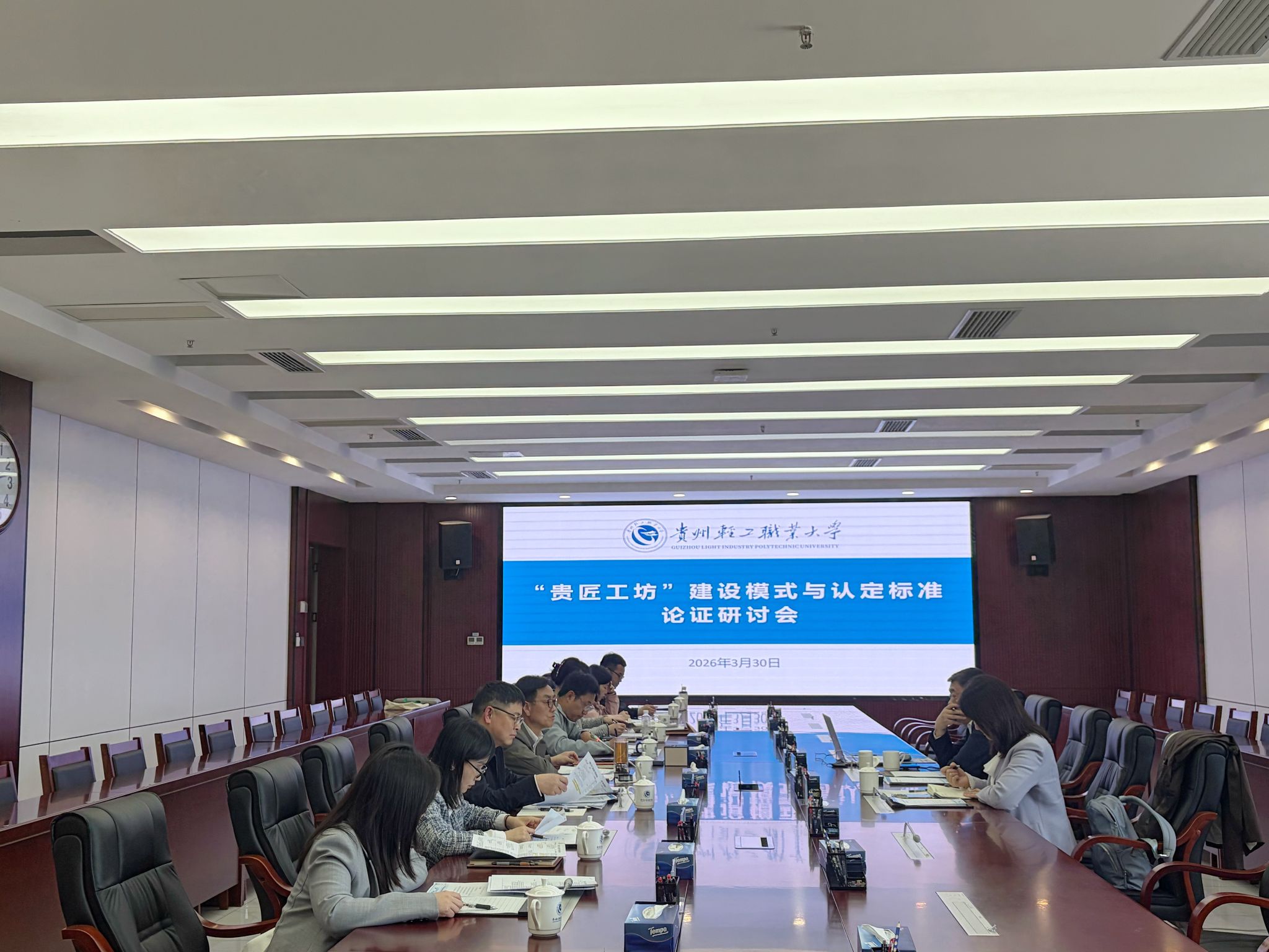 随后,我校及贵商职院相关负责人依次汇报“贵匠工坊”认定标准编制情况,与会人员围绕建设模式优化、认定标准细化等核心议题研讨献策,为标准定稿落地奠定基础。