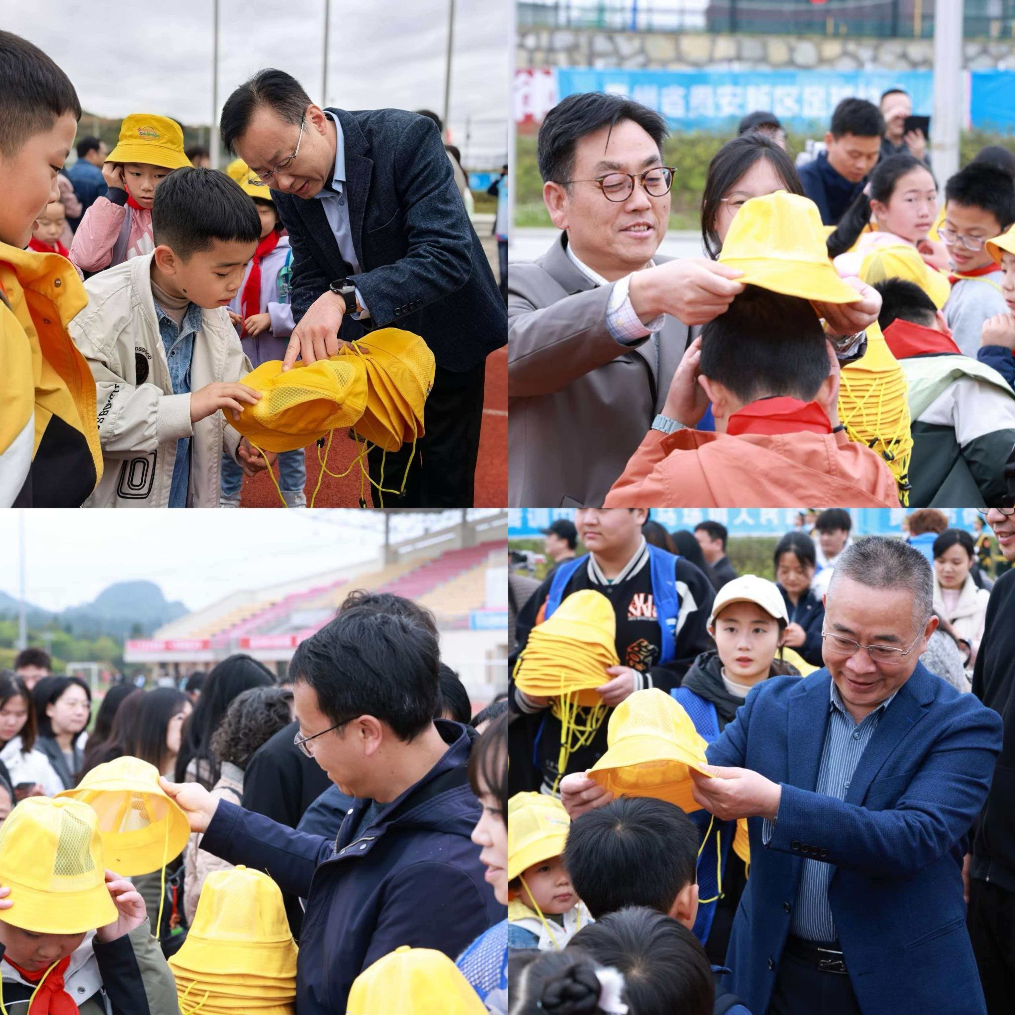 学校领导为教职工子弟佩戴研学帽