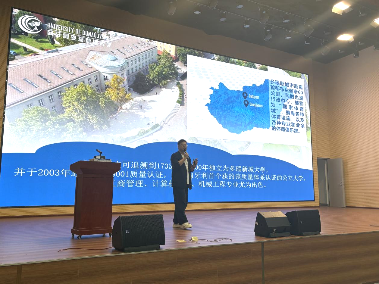 讲座现场,郝文博先生首先对多瑙新城大学的办学历史、学术实力与校园环境作了整体介绍。他表示,作为匈牙利一所优秀的公立大学,多瑙新城大学在多个学科领域具有显著优势,并为国际学生提供了安全、友好且支持全面的学习环境。
