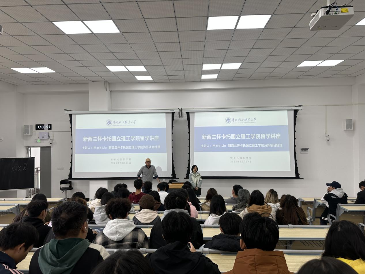 为深化我校国际化人才培养路径,助力学生拓宽学术视野与未来发展通道,新西兰怀卡托理工学院(Wintec)留学专题讲座于2025年10月24日下午在乐学楼306教室举行。本次讲座特邀国立新西兰理工学院-怀卡托理工学院海外项目经理Mark Liu作为主讲嘉宾,为怀卡托国际学院的同学们带来了一场权威且富有启发性的留学指导。