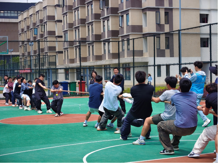 三是力量凝聚团队,拔河燃爆主场。作为主会场的压轴戏,拔河对抗赛震撼上演。伴随着清脆的哨声,参赛队员们紧握长绳、重心下压,场外同学们的呐喊声震耳欲聋。一条麻绳,完美诠释了机电学子“心往一处想、劲往一处使”的强大凝聚力。