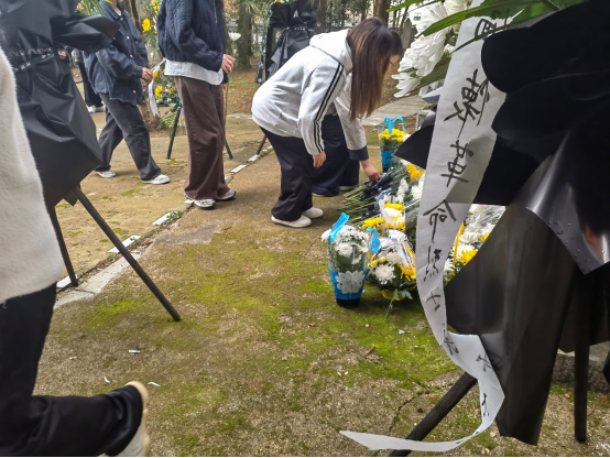 全体师生手捧白菊,依次缓步走到纪念碑前,将圣洁的菊花轻轻放下,并向先烈深鞠一躬,以此告慰烈士英灵。