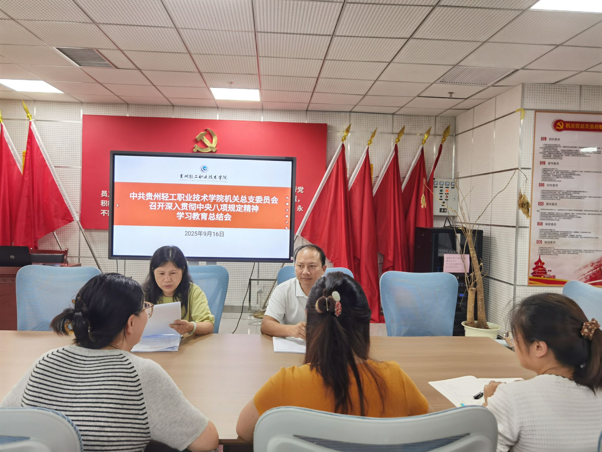 9月16日中午,机关党总支在合一楼217党员活动室召开了深入贯彻中央八项规定精神学习教育总结会。机关党总支委员参会,会议由王瑾书记主持。