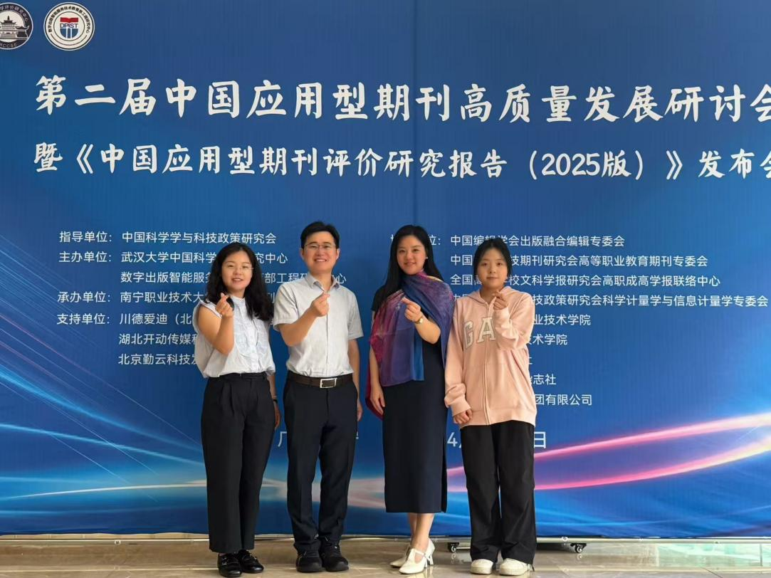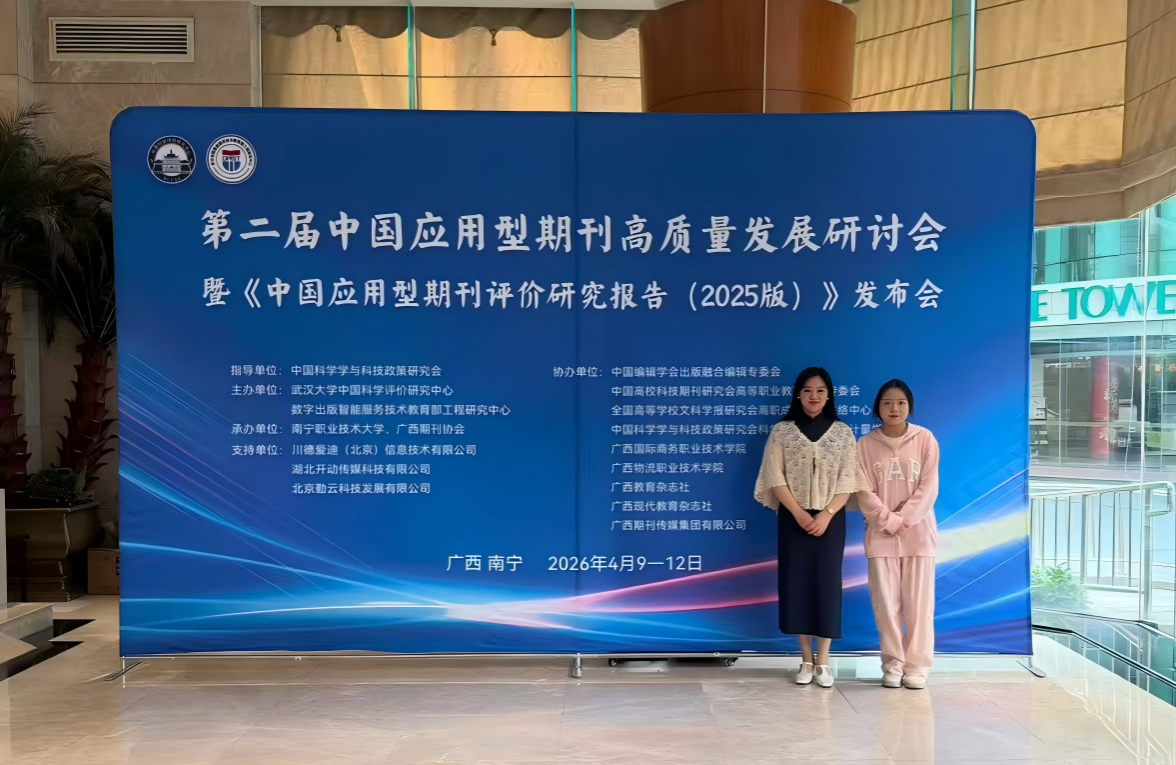 4月10日至12日,第二届中国应用型期刊高质量发展研讨会暨《中国应用型期刊评价研究报告(2025版)》发布会在广西南宁举行。参会的有来自马来西亚、老挝、新加坡、越南、菲律宾的期刊代表,以及国内教育界、出版界等领域的专家学者共380余人。我校贵州职业教育质量研究中心周聃教授、科研助理刘宇跃参会。 我校代表在参会现场合影 本次会议以“面向行业需求,服务应用创新——推进数智时代应用型期刊的高质量协同发展之路”为主题,设主旨报告、圆桌论坛、校长论坛及专题交流等多个环节。会议由南宁职业技术大学党委常委、副校长王凤岭主持,中国新闻出版研究院副院长倪轶、广西期刊协会会长陈朝明、南宁职业技术大学党委书记蹇兴超出席并致辞。 倪轶副院长指出,《中国应用型期刊评价研究报告》作为国内首个面向应用型期刊的专项评价体系,为识别期刊独特价值、引导差异化发展提供了重要分析工具。陈朝明会长强调,应用型期刊在成果转化、人才培养和服务经济社会高质量发展中发挥着不可替代的作用。蹇兴超书记表示,构建中国特色应用型期刊评价体系,是服务教育强国建设、推动学术期刊繁荣和产业技术创新的重要实践。 此次研讨会由中国科学学与科技政策研究会指导,武汉大学中国科学评价研究中心与武汉理工大学数字出版智能服务技术教育部工程研究中心主办,南宁职业技术大学、广西期刊协会联合承办。会上,武汉大学中国科学评价研究中心常务副主任杨思洛教授正式发布《中国应用型期刊评价研究报告(2025版)》,系统解读了报告研制思路、评价方法、主要结果及未来方向。学校代表以此为契机,积极与武汉理工大学数字出版智能服务技术教育部工程中心就中心赋能院校关键办学能力要素提升路径、学报建设发展思路,国际期刊申报建设、应用型期刊质量评价要素框架,以及人工智能+教育出版模式等问题进行了深入交流。 我校代表与武汉大学中国科学评价研究中心常务副主任杨思洛合影 (左一:杨思洛;右一:周聃) 我校代表与数字出版智能服务技术教育部工程研究中心期刊部合影 (左二:期刊部部长童明坤;右二:周聃) 会后,我校代表借此机会赴南宁职业技术大学职业教育研究中心及学报编辑部进行交流,围绕当前学报发展面临的共性问题与困境、中心智库建设等展开座谈,汲取了宝贵经验。 我校代表赴南宁职业技术大学学报编辑部交流 (左三:《南宁职业技术大学学报》主编 韦国友) 通过参加本次会议,我校贵州职业教育质量研究中心进一步明确了应用型期刊建设思路、评价导向与发展趋势,加强了与国内外高水平期刊评价机构、兄弟院校及出版单位的联系,为今后推动刊物《贵州职业教育研究》提质进位、服务学校高质量发展奠定了良好基础。