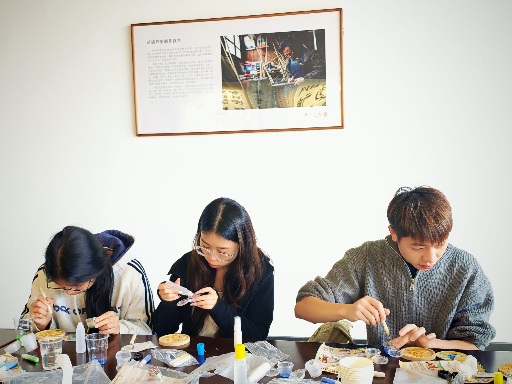 活动现场,同学们沉浸式体验非遗手工魅力。掐丝环节中,同学们手持细如发丝的铜丝,对照设计图案凝神专注,耐心弯折、细致拼接、小心粘贴,反复调整、精益求精,力求每一处丝纹衔接都严丝合缝,尽显沉稳耐心与专注匠心。随后的点蓝环节更考验审美与细心,同学们立足审美巧思,精心搭配色彩,夹取各色珐琅釉料,小心翼翼填入丝纹之间。大家以釉为墨、以丝为骨,或浓淡相宜营造层次,或冷暖碰撞凸显意境,原本简洁的铜丝框架,在斑斓釉料的装点下渐次鲜活,每一件作品都独具创意、饱含心意。