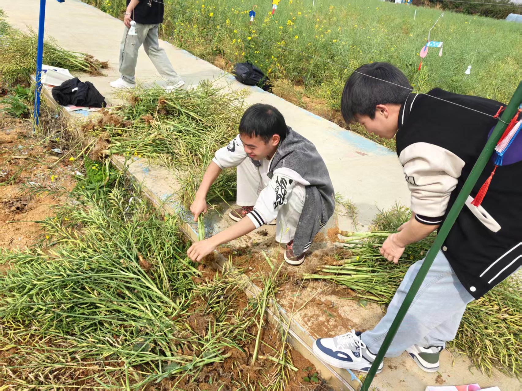 春日的劳动教育基地,金黄的白菜花海已悄然结籽。同学们撸起袖子,弯腰走进菜地,徒手将结满籽粒的菜秆连根拔起,一捆捆抱到指定地点集中晾晒。阳光洒在脸上,汗水滑过脸颊,大家齐心协力,将整片菜地收拾得干干净净。