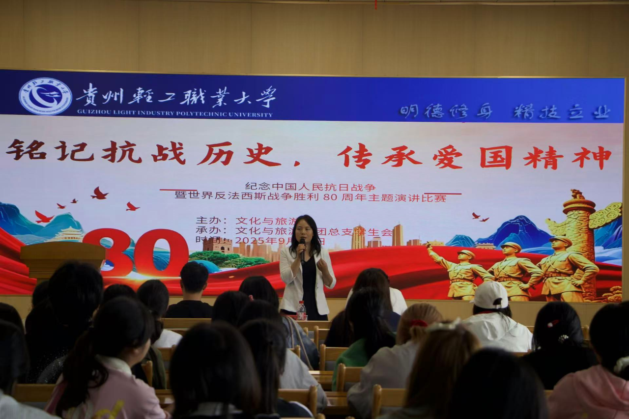 为引导学生铭记中国人民抗日战争暨世界反法西斯战争的光辉历史,缅怀革命先烈,厚植爱国情怀,强化历史责任感,2025年9月23,文化与旅游系在学生事务中心321会议室举办“纪念中国人民抗日战争暨世界反法西斯战争胜利80 周年”主题演讲比赛。本次比赛亦是系部系列主题纪念活动的重要开篇,学生管理科长侯彩义老师、刘洪老师、团总支陈富友老师、杨芸老师受邀担任评委,2024 级、2025 级共 9 名选手同台竞技,150 余名师生到场观赛。
