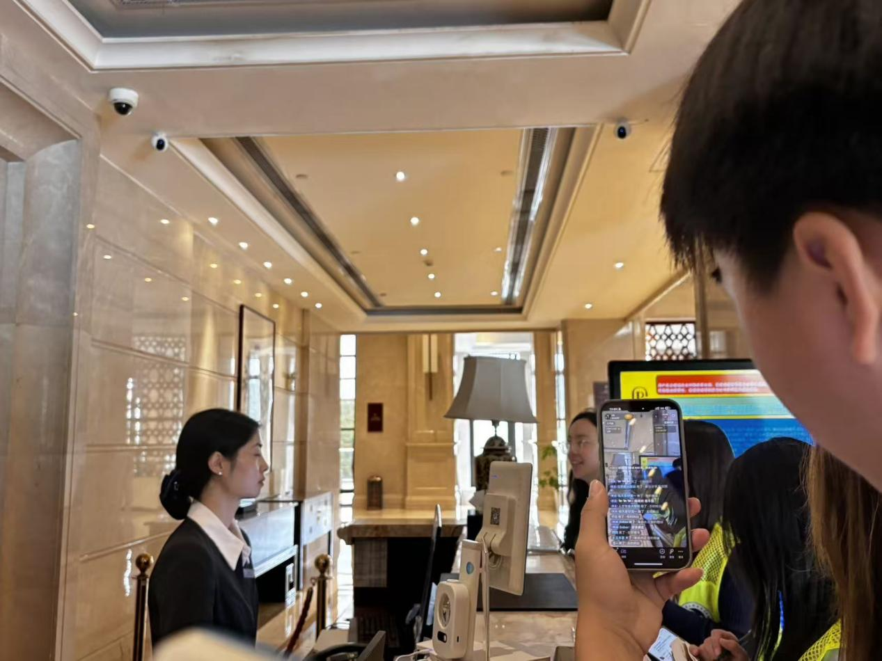 为避免实训流于“参观式走过场”,教研室设计了两项核心任务:一是专项深度调研,田琪老师带领5名同学深入前台,与工作人员一对一访谈,探究客户入住登记、投诉处理等实际工作逻辑;张瑞睿老师带领10名同学走进宴会厅,观摩宴会筹备全流程。二是直播共享,调研过程以“直播+互动”形式开展,未参与专项小组的同学们通过直播“云参与”,还能在线提问,实现“一人调研,全员受益”。