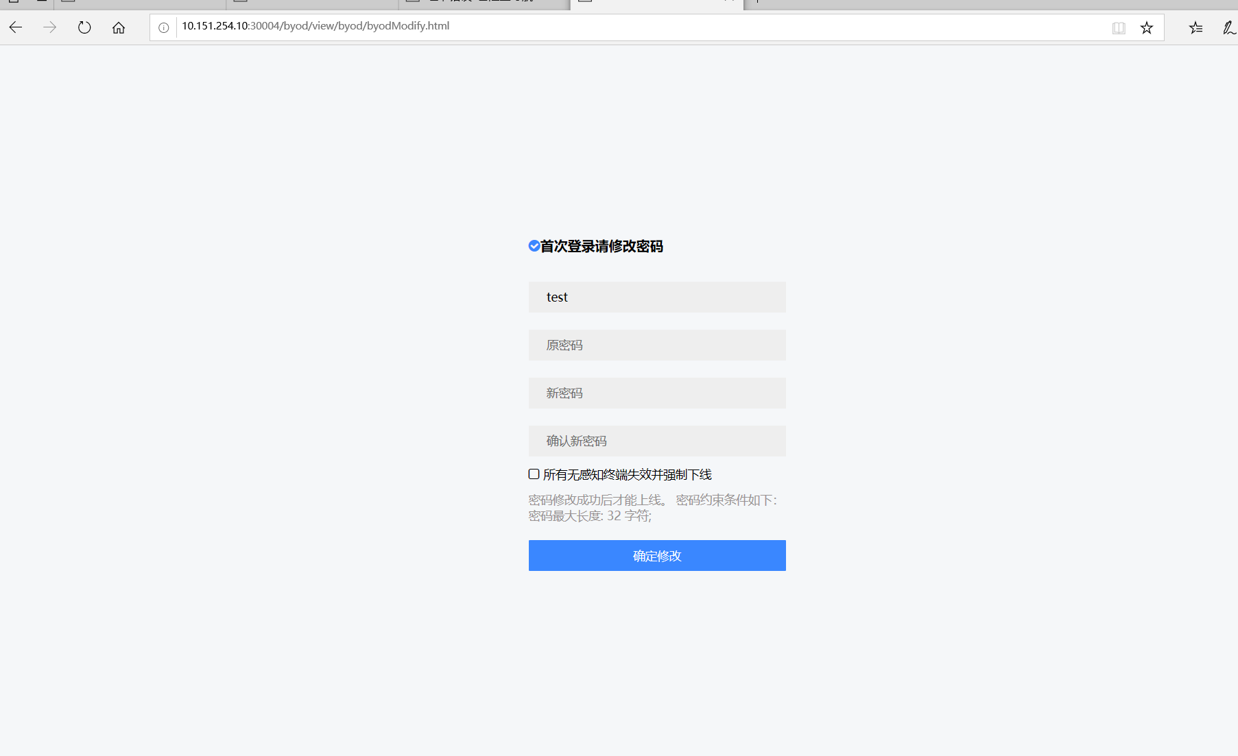 二、第一次登陆强制改密码,弹出图2界面 原密码为123456789或123456、新密码可以自定义,点击确认修改,无需勾选(所有无感知终端失效并强制下线)该选项。